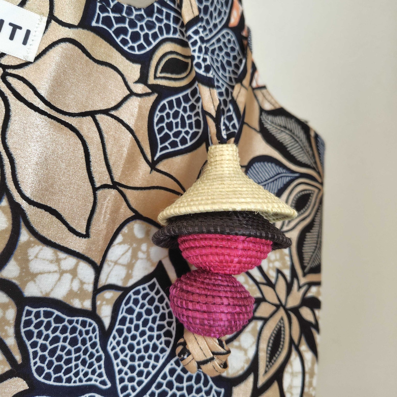 チャームはサイザル麻を繊維状にして、一つひとつ手編みしたもの。