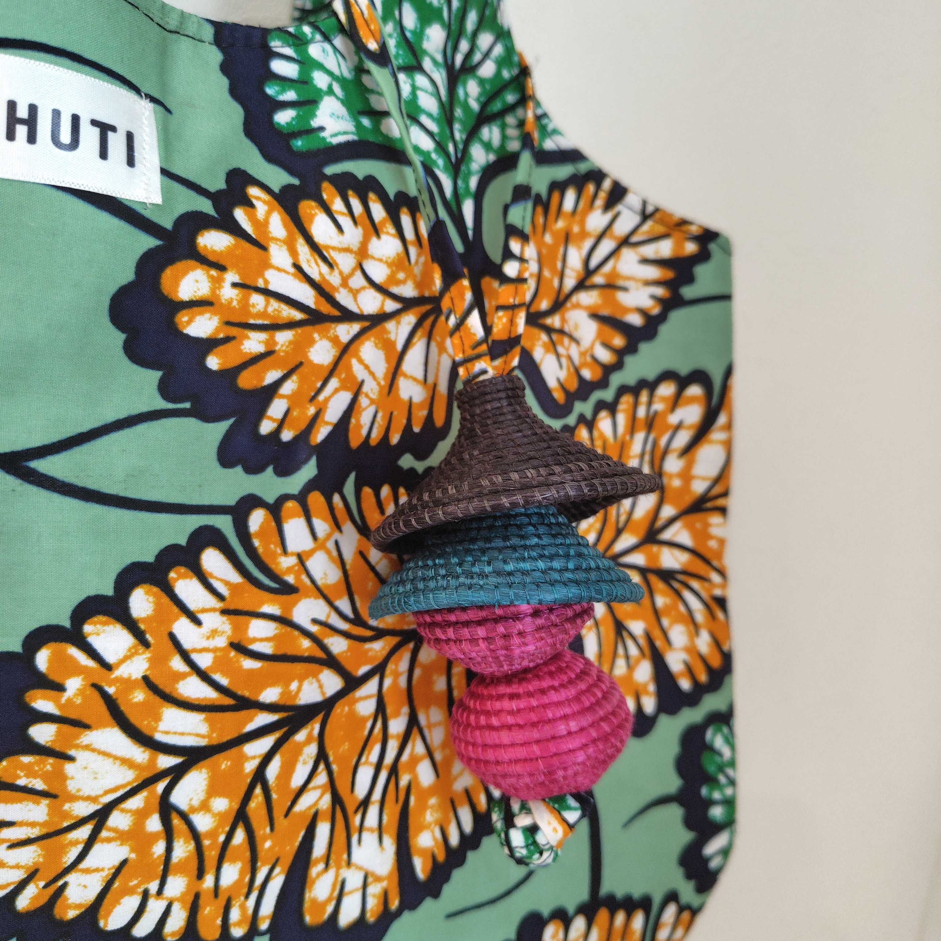 チャームはサイザル麻を繊維状にして、一つひとつ手編みしたもの。