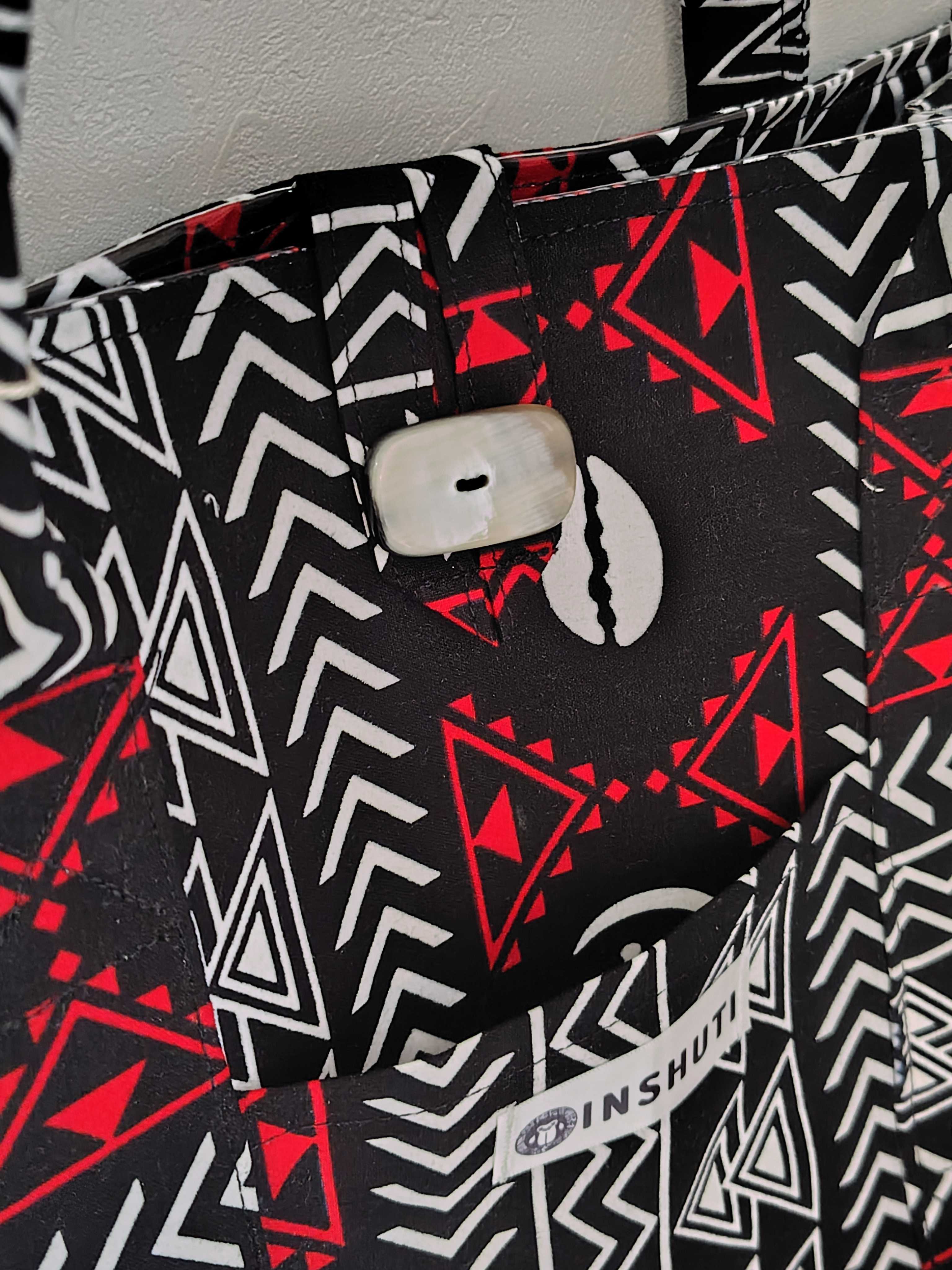 内側にファスナー付きポケット、外側にオープンポケットあり。