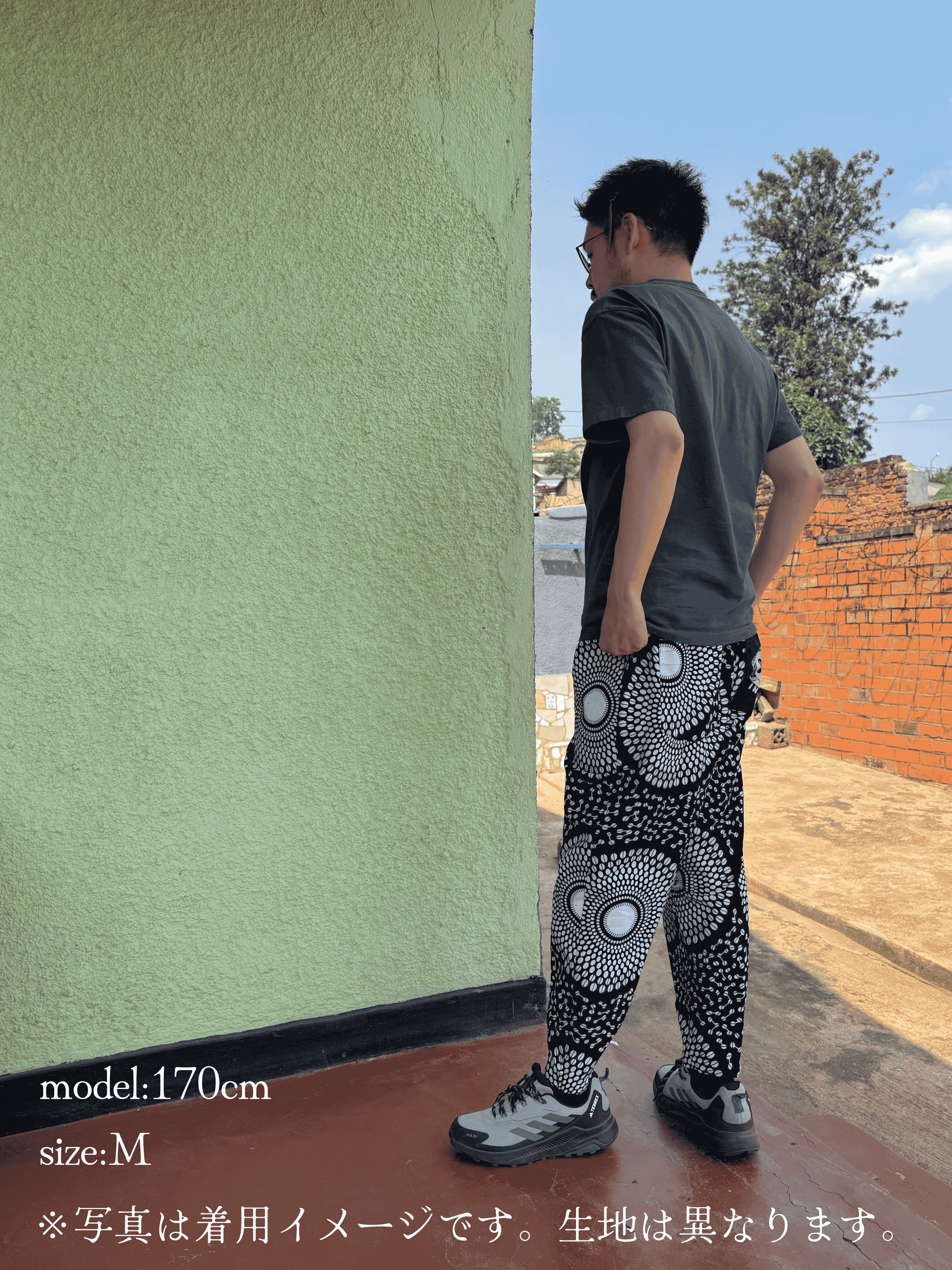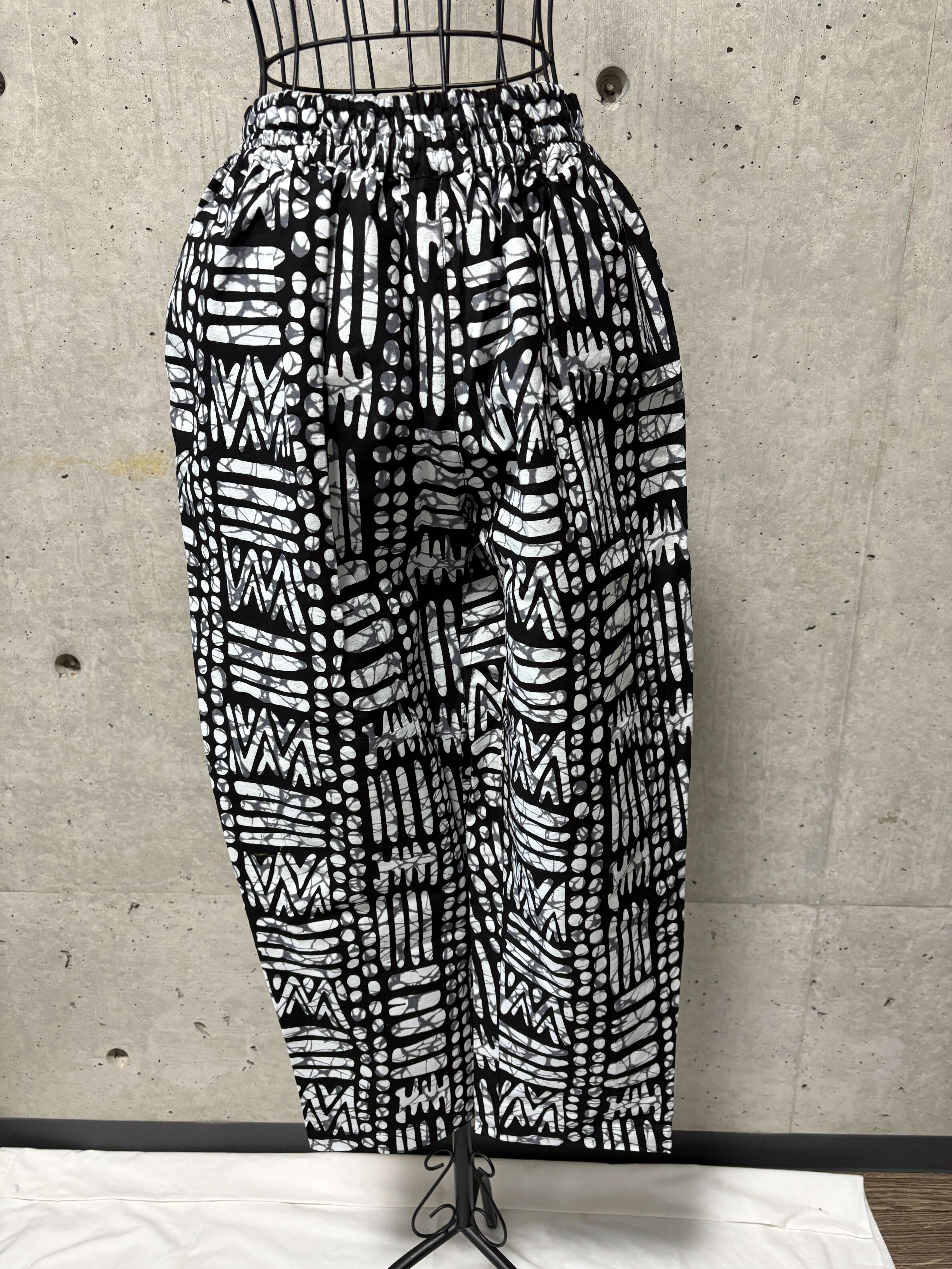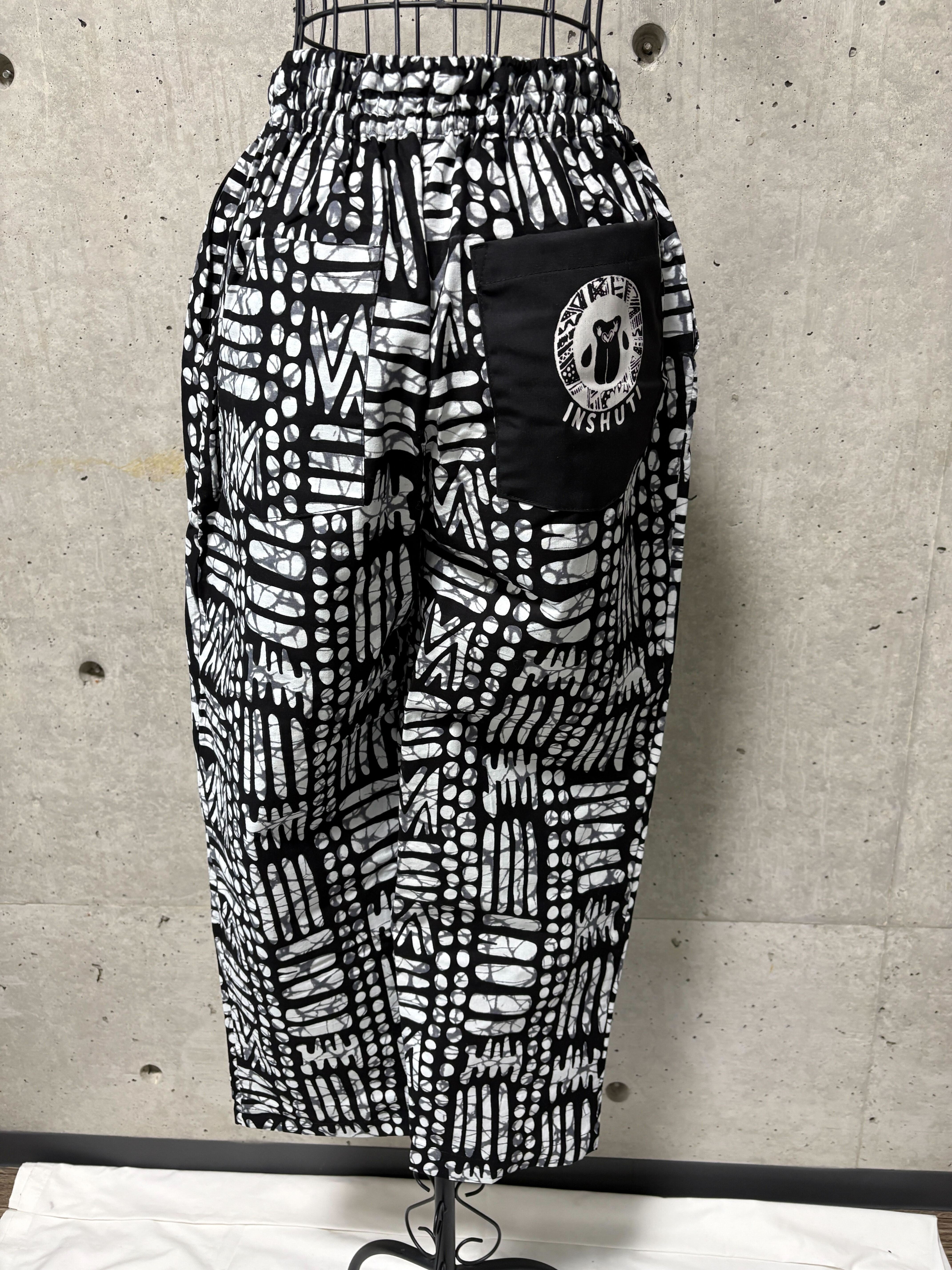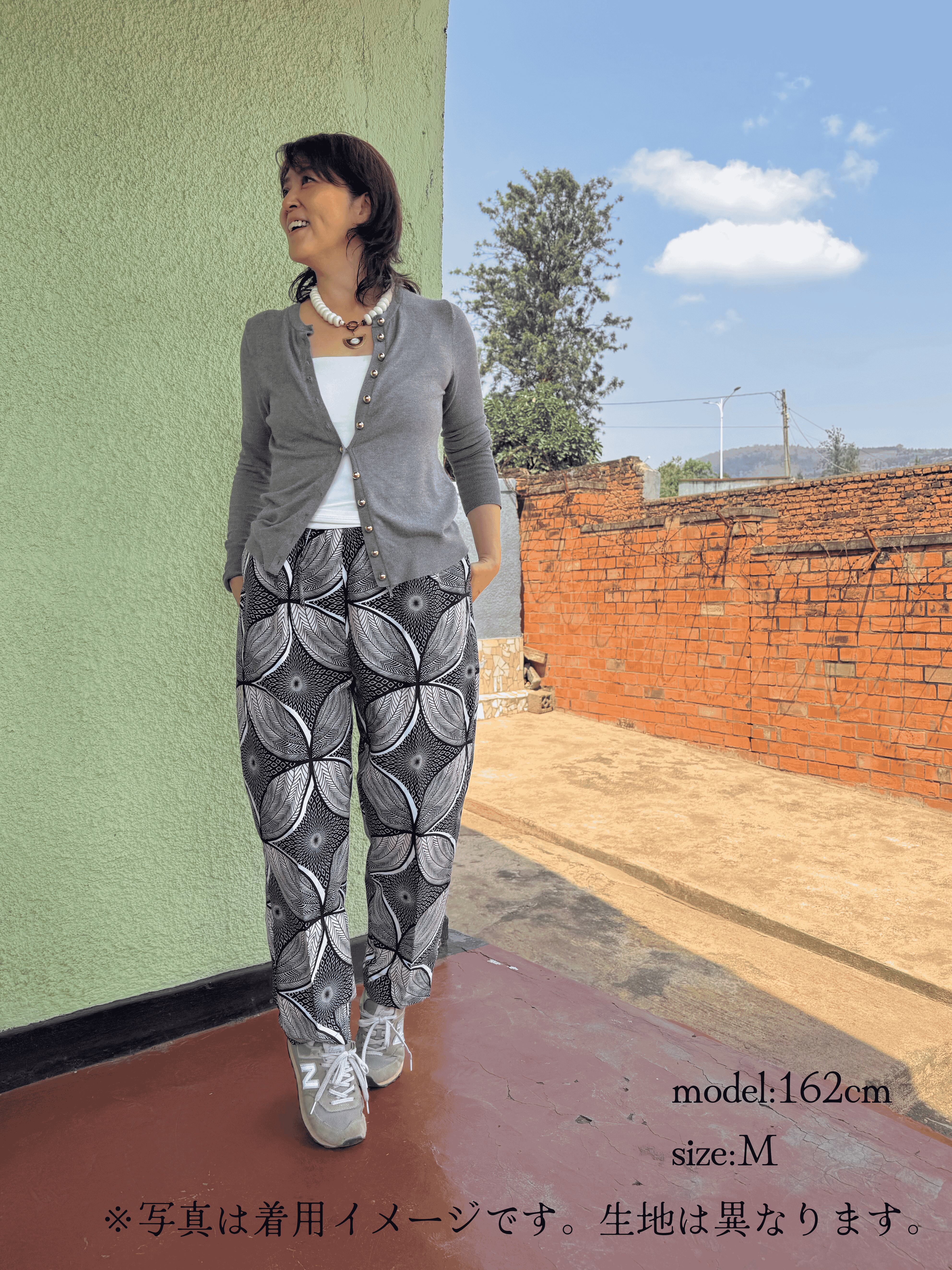ルワンダで出会ったアフリカンプリント生地を使い、日常に取り入れやすいパンツに仕立てました。