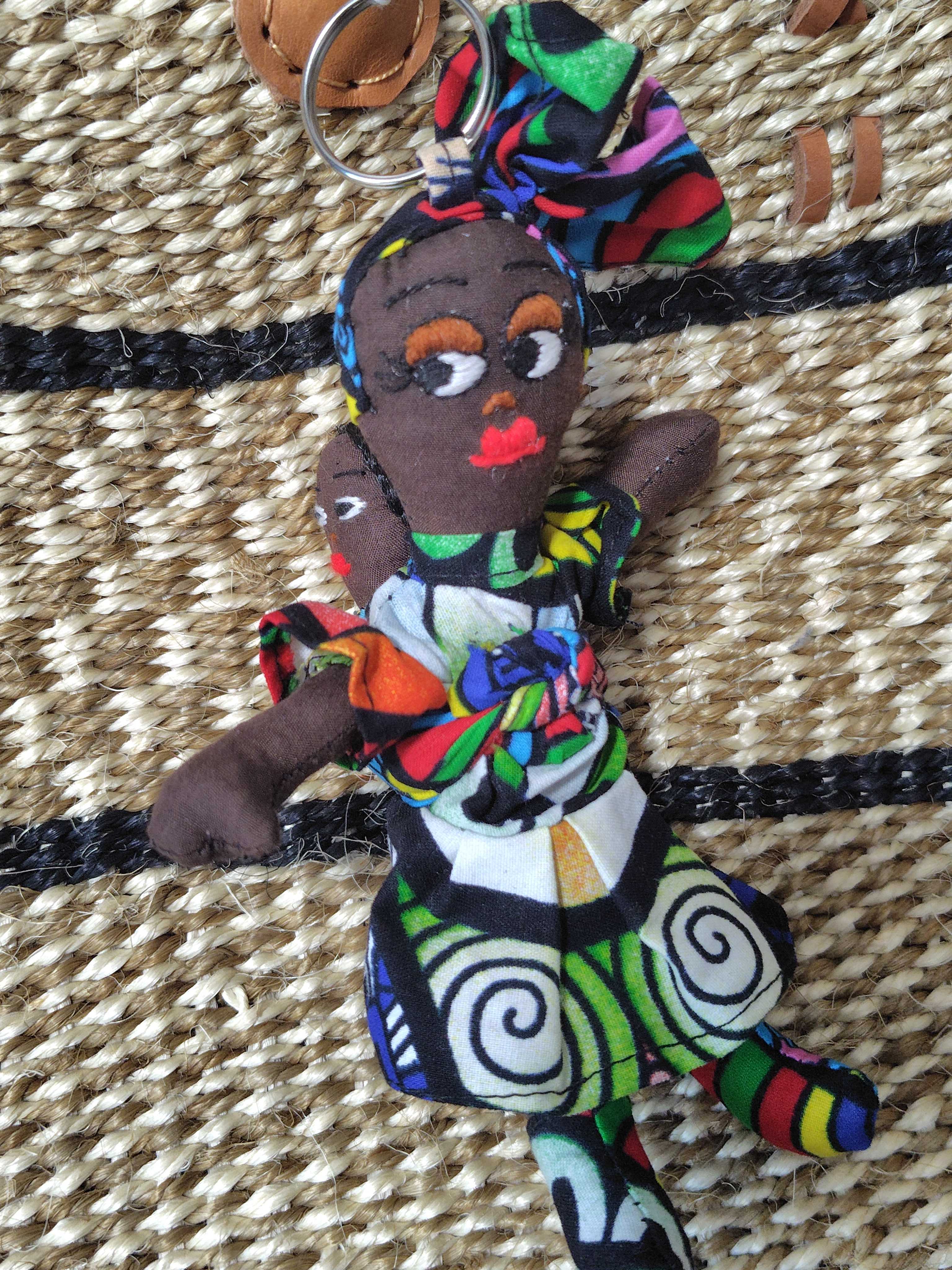 この子はお揃いのターバンとワンピースを身に着けて、背中に赤ちゃんをおんぶするアフリカンママン。