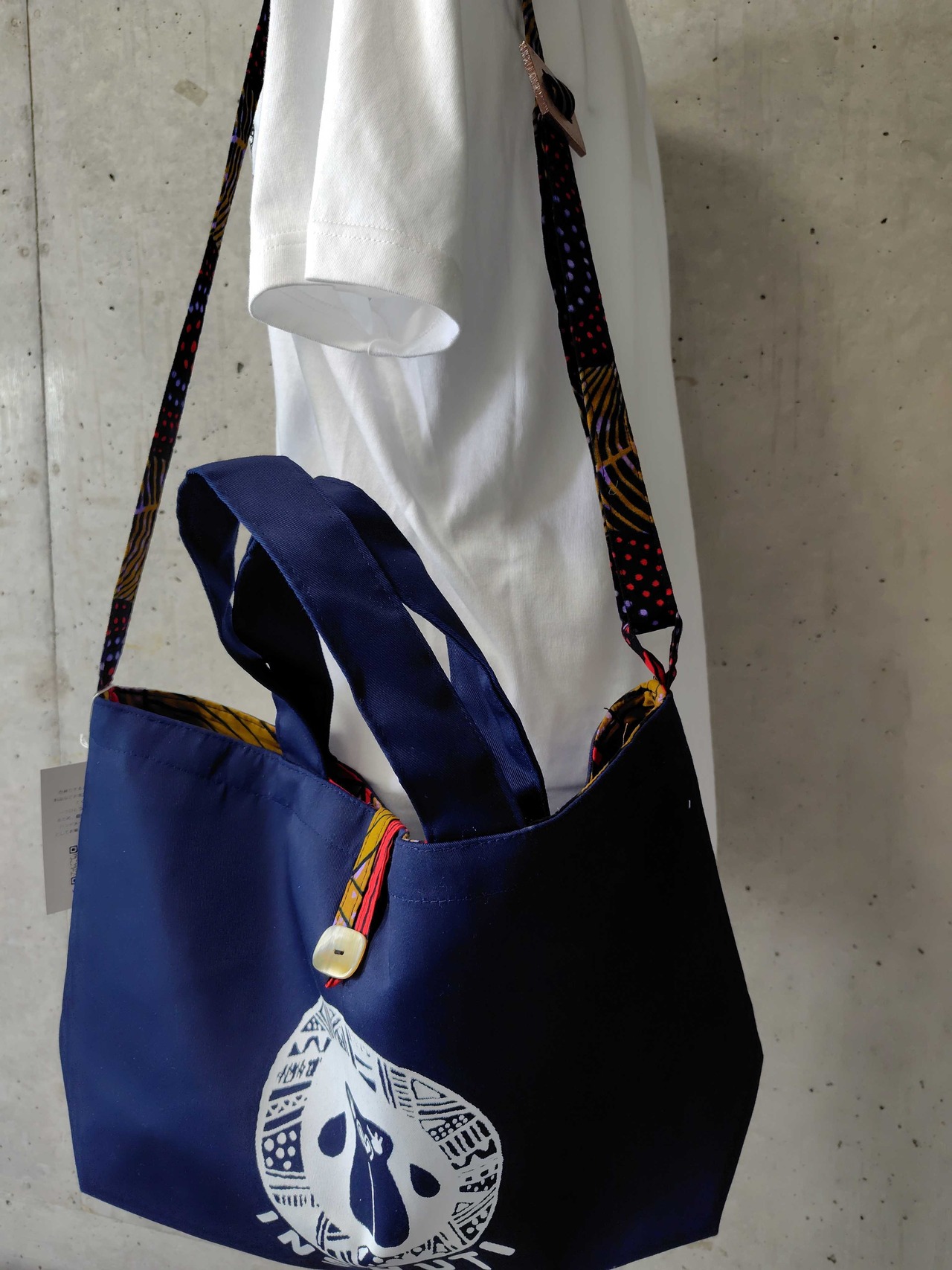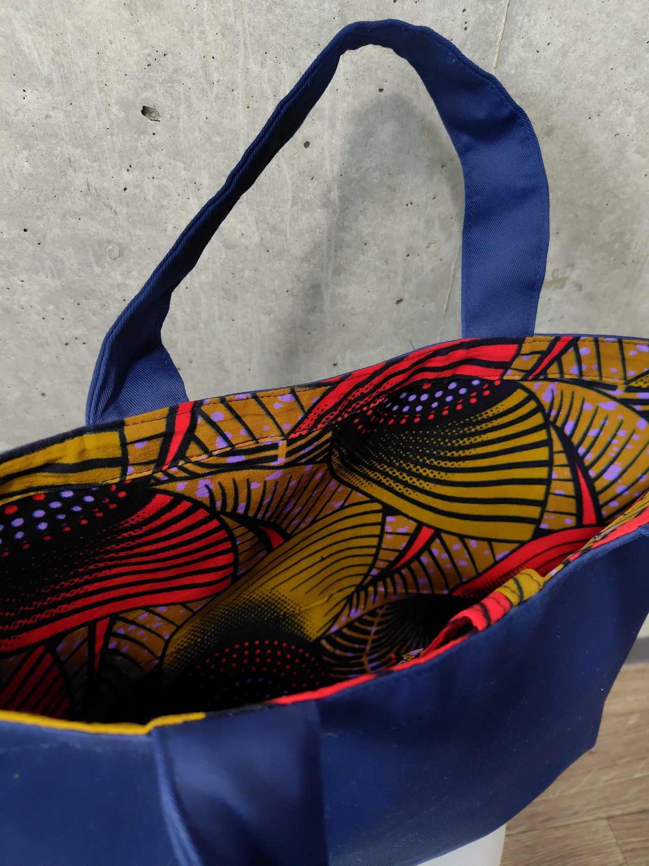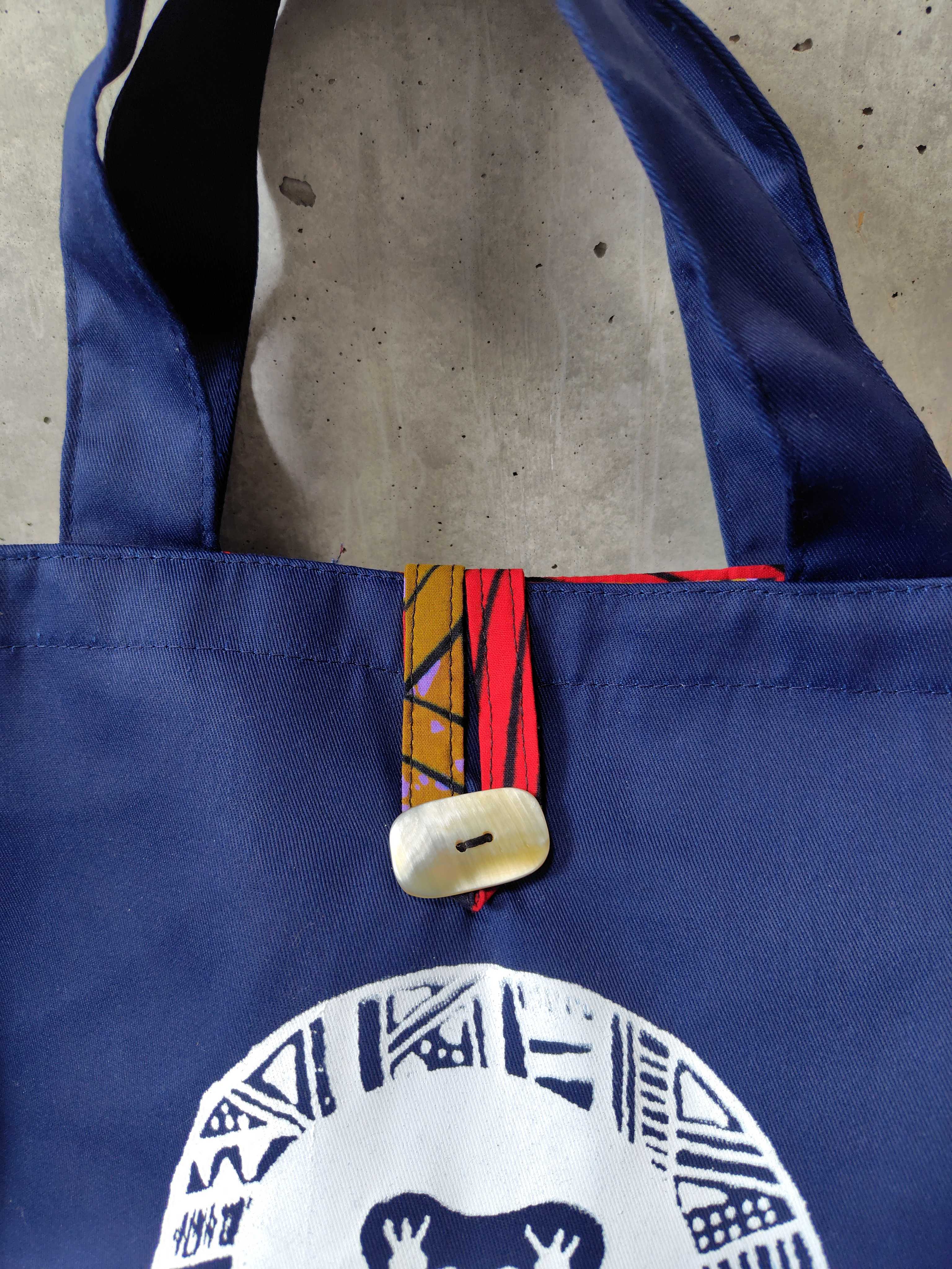 ②内側と持ち手には鮮やかなキテンゲ生地を使用
