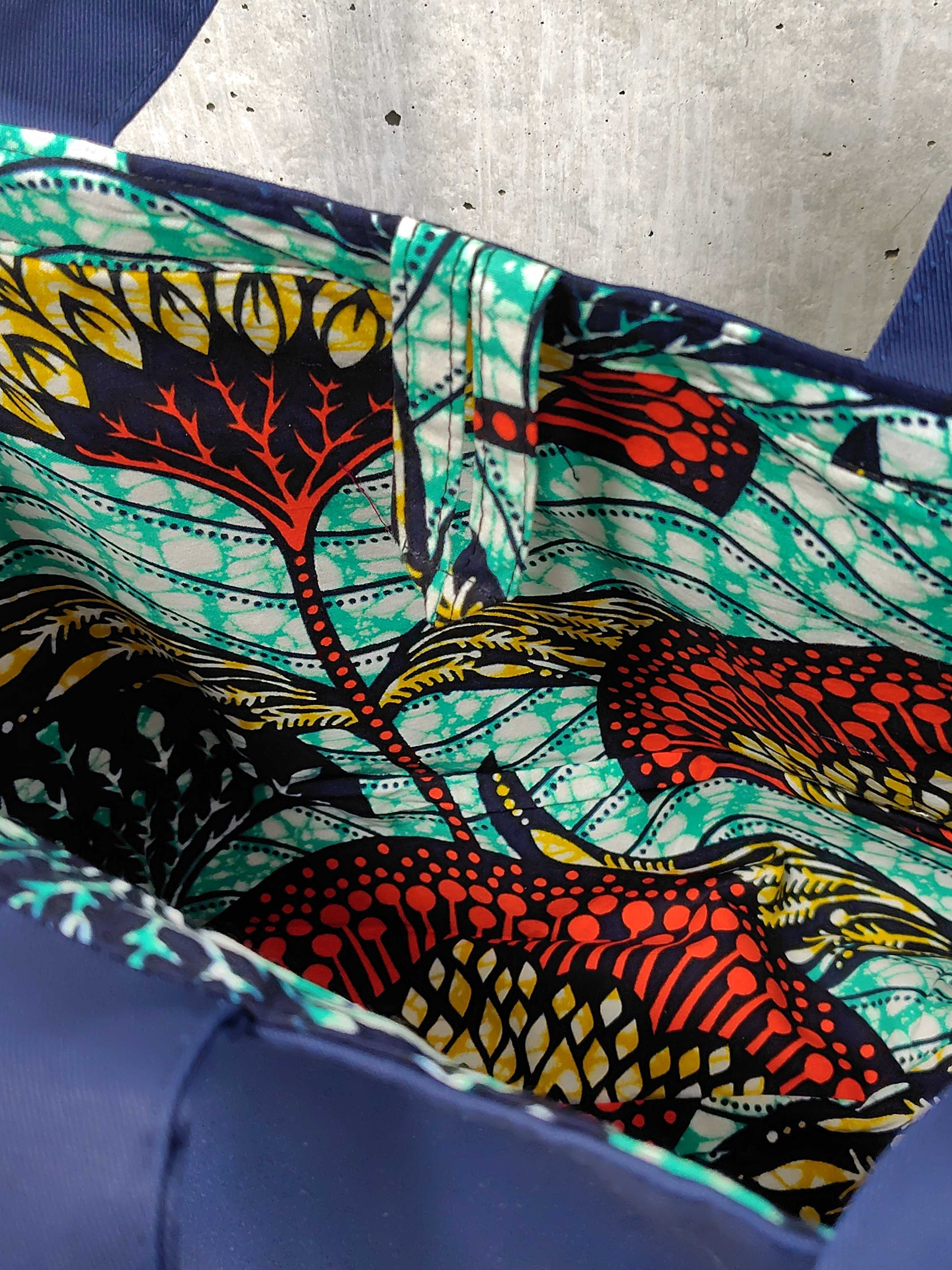 ②内側と持ち手には鮮やかなキテンゲ生地を使用
